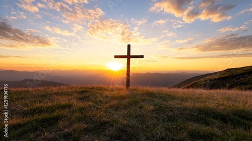 Serene Sunrise Over Mountain Landscape with Cross Silhouette at Dawn : Generative AI