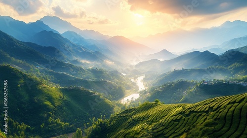 Serene Sunrise Over Verdant Terraced Hills