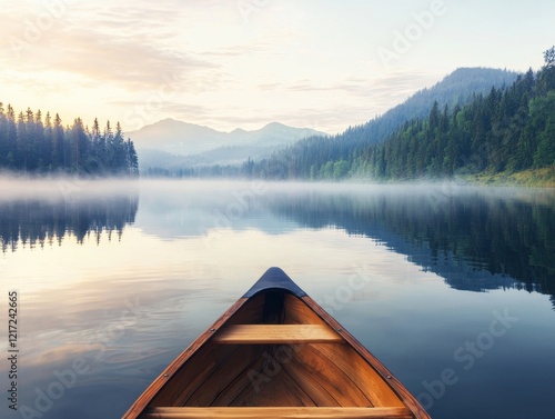 canoe, lake, mountain, sunrise, mist, fog, calm, peaceful, serene, tranquil, water, nature, landscape, scenery, adventure, travel, journey, exploration, wilderness, wood, forest, tree, evergreen, quiet, stillness, calm water, morning, daybreak, dawn, light, sun, sky, cloud, relaxation, escape, get-away, solitude, voyage, boating, paddling, wooden boat, calmness, serenity, peace