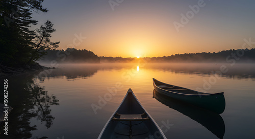 Serene Sunrise Two Canoes on Misty Lake at Dawn Peaceful Nature Scene