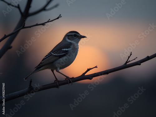 Serene Sunset Bird Silhouette: Grey Bird on Branch, Tranquil Nature Dusk, Peaceful Wildlife Image, Soft Orange Glow