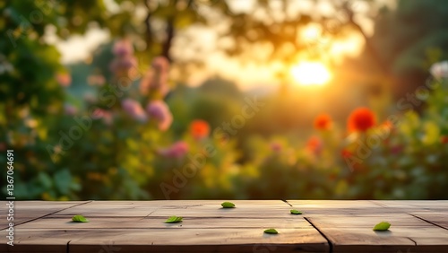 Serene sunset garden scene with a rustic wooden table, bathed in warm golden light and a soft focus on vibrant blooms.