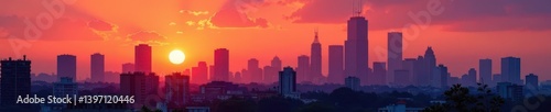 Serene sunset hues paint urban skyline, textured buildings bathed in warm light , blue, tranquil