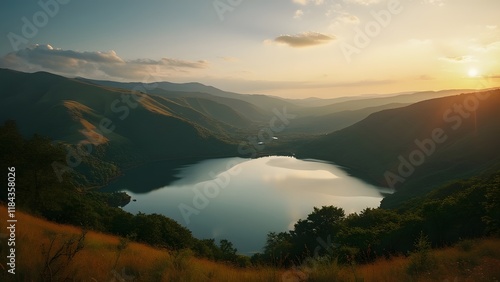 Serene Sunset Lake in Rolling Green Hills, Golden Hour Landscape Photography