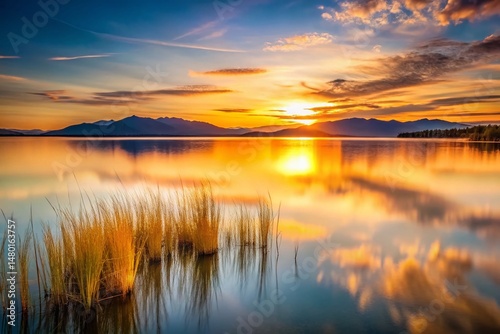 sunset, lake, mountain, landscape, golden hour, nature, serenity, calm, peaceful, water, sky, sun, grass, photo, long exposure, beautiful, scenic, tranquil, evening, dusk, horizon, silhouette, still, serene, relaxing, travel, view, background, image, photo, picture, royalty free, hi-res, amazing, breathtaking, idylli, magical, wonder, awesome, fantastic, stunning, spectacular