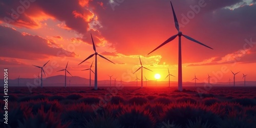 sunset, renewable energy, clean energy, alternative energy, power generation, wind power, landscape, nature, environment, ecology, sustainability, energy production, horizon, sky, cloud, field, grass, red sky, evening, dusk