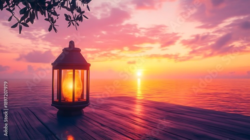 Serene Sunset Lantern: A vintage lantern glows warmly against a backdrop of a breathtaking sunset over the ocean. Capture the tranquil moment of a seaside dusk.