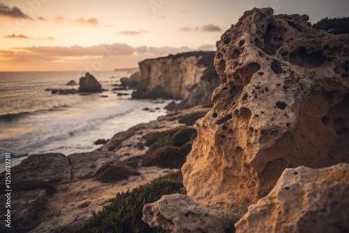 harmonious, trendy, sunset, coastal, rock formation, ocean, textured, detail, blurred background, atmospheric, serene, moody, soft light, warm tones, natural light, golden hour, twilight, seascape, cliff, stone, earth-tone, beach, wave, water, sky, cloud, calm, peaceful, calmness, elegance, sophistication, organic, natural beauty