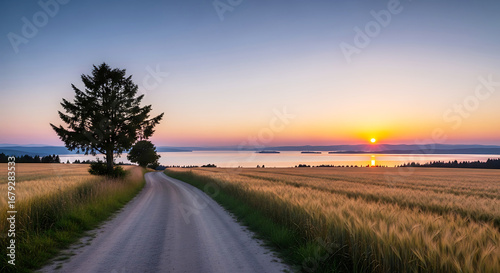 sunset, sunrise, country road, dirt road, winding road, wheatfield, grainfield, agriculture, farming, landscape, nature, rural, countryside, lake, water, horizon, sky, cloud, twilight, dusk, dawn, evening, morning, tree, evergreen, road, highway, asphalt, travel, field, cloud, sun, way, empty, car, country, long, summer, route, green, journey, speed, perspective