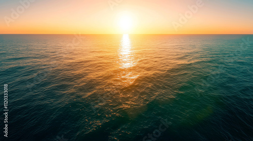 Serene Sunset Over Calm Ocean Waters with Gentle Waves and Golden Sky Reflection