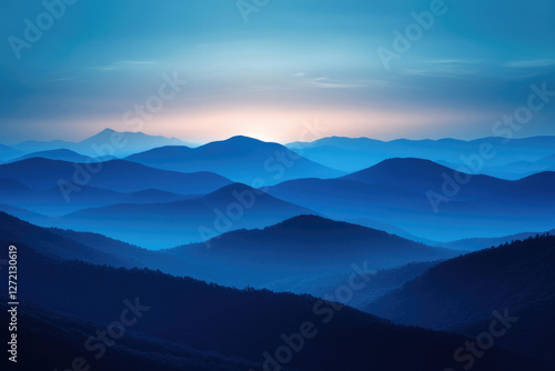 Serene sunset over layered blue mountains, a breathtaking view of nature's beauty.