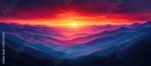 Serene sunset over layered purple mountains showcasing vibrant red and orange hues in the sky creating a tranquil nature scene
