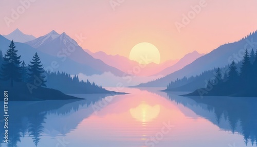 Serene Sunset over Misty Mountain Lake Peaceful landscape illustration with a sun reflecting on calm water