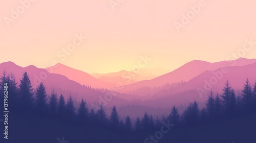 mountain, range, sunset, sunrise, mist, fog, hazy, purple, pink, orange, yellow, sky, cloud, tree, forest, pine, conifer, silhouette, landscape, scenery, nature, outdoors, scenic, view, vista, tranquil, peaceful, serene, calm, quiet, majestic, awe, inspiring, beauty, wonder, magical, dreamy, aethereal, soft, gentle, light, shadow, colours, gradient, horizon