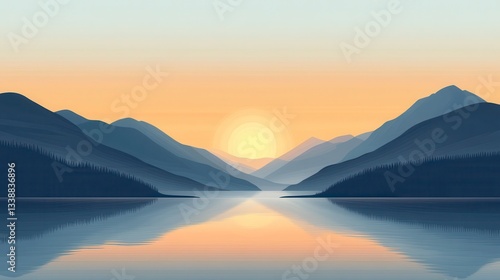Serene Sunset over Mountain Lake Minimalist Landscape Illustration