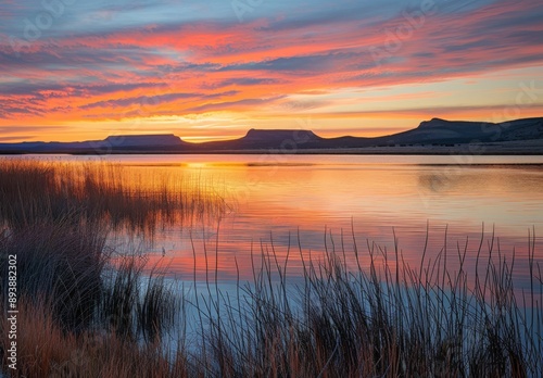 serene sunset over the Black Body. The lake reflects an orange and blue sky, with some clouds visible in the distance