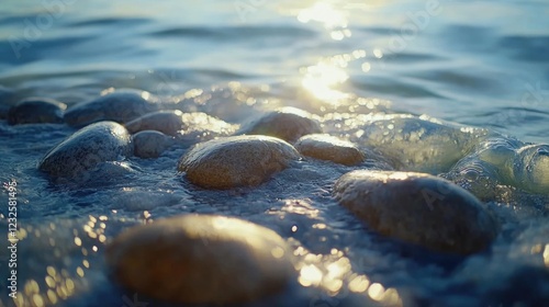 rock, water, sea, ocean, stone, wave, beach, shore, coast, sunset, sunrise, sunlight, foam, ripple, texture, calm, serene, peaceful, tranquil, relaxing, nature, photo, landscape, blue, gold, light, sparkle, shine, closeup, macro, detail, smooth, round, wet, sea foam, water, marin, coastal, summer