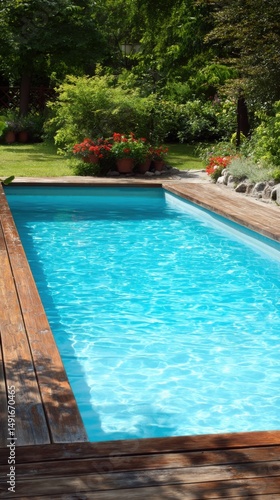 pool, water, garden, wood, summer, sunlight, turquoise, backyard, flower, plant, deck, edge, tile, stone, grass, tree, shrub, bloom, container, nobody, surface, ripple, light, shadow, texture, plank, border, botany, flora, lawn, foliage, day, tranquil, serene, peaceful, calm, relaxing, holiday, vacation, leisure, lifestyle, nature, environment, architecture, design, element, detail