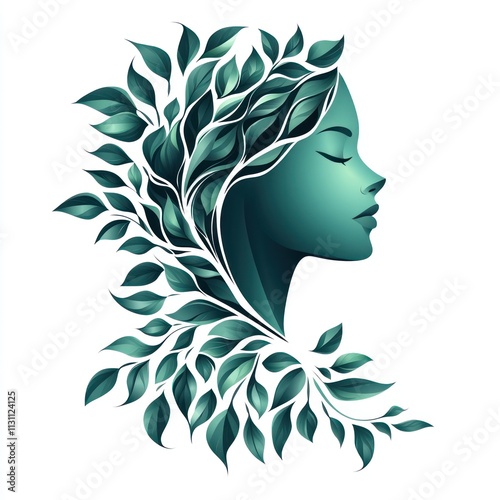 woman, leaf, green, nature, beauty, profile, serene, teal, leaf, female, head, face, hair, plant, foliage, elegant, graceful, calm, peaceful, tranquil, organic, healthy, fresh, vibrant, ecology, environment, growth, spring, summer, illustration, art, design, graphic, image, visual, abstract, symbolic, spiritual, goddess, mythical, feminine, style, vector