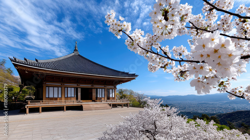 temple, cherry blossom, blue skies, peaceful, nature, architecture, spring, landscape, traditional, flower, scenic, japan, calmness, historic, cultural, garden, mountain view, sunlight, vibrant, seasonal, beauty, heritage, travel, relaxation, zen, floral, scenic view