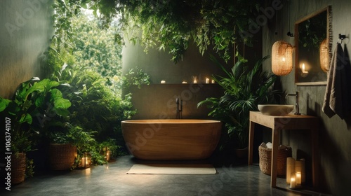 bathroom, tropical, greenery, plant, natural, wood, luxury, decor, peaceful, lighting, zen, spa, relaxation, design, nature, aesthetic, interior, sanctuary, modern, fresh, stylish, calm, ambience, vibrant, home, indoor, beautiful, environment, comforting, soothing, warm, inviting, space, calmness, organic, minimalist, elegant, texture, serene, charming, artisan, harmonious, wellness, escape, recharge, refresh