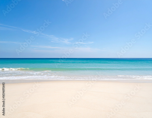 beach, sand, ocean, sea, water, sky, blue, turquoise, horizon, wave, calm, tranquil, peaceful, serene, summer, sun, bright, clear, day, coast, shoreline, tropical, paradise, vacation, holiday, travel, get-away, relaxation, rest, escape, nature, landscape, scenic, view, beautiful, picturesque, white, soft, gentle, warmth, sunlight, light, cloud, atmosphere, freedom, happiness, serenity, calmness, peace