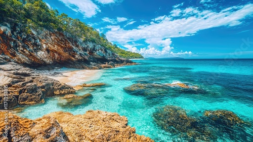beach, ocean, water, sky, cloud, rock, nature, landscape, shore, coastline, tropical, vacation, paradise, tranquil, summer, scenery, travel, environment, marin, scenic, wilderness, bright, sunny, rainforest, sunlight, horizon, shoreline, relaxation, photo, outdoors, seascape, deserted, beauty, vibrant, exploration, adventure, peaceful, clearwater, breathtaking, nature reserve, blue water, wildlife, coastal, vivid colors