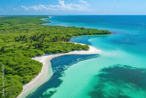 Serene tropical coastline with clear turquoise waters and lush greenery under a bright blue sky