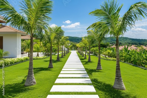 palm, tree, path, stone, grass, lawn, sky, cloud, hill, landscape, tropical, paradise, resort, villa, garden, paseo, architecture, building, exterior, summer, sunny, day, green, blue, white, perspective, design, estate, vacation, travel, tour tourism, nature, plant, nobody, scenic, destination, country, sunlight, tranquil, calm, peaceful, serene, idylli, luxurious, modern, contemporary, minimalist