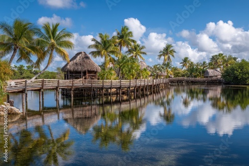 Serene Tropical Village, Wooden Bridge Reflecting Clouds.