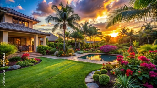 serene, upscale, landscaped, backyard, lush, green, lawn, vibrant, flower, tropical, plant, sunset, luxury, design, garden, patio, relaxation, serenity, beauty, calmness, harmony, nature, grass, foliage, tree, architecture, aesthetic, modern, contemporary, stylish, elegant, expansive, scenery, view, focal, point, colours, palette, soothing, calming, peaceful, idylli, picturesque