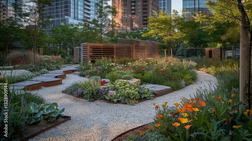 Serene urban garden with winding paths, vibrant flowers, and modern buildings in the background