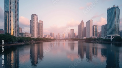 Serene Urban Landscape with Modern Skyscrapers Reflecting Water