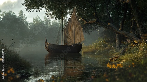 boat, ship, water, lake, forest, tree, calm, serene, mist, fog, morning, sunlight, nature, landscape, scenic, peaceful, tranquil, quiet, still, timberland, vegetation, shore, bank, summer, daytime, outdoors, travel, journey, adventure, exploration, discovery, mystery, enigma, ancient, historical, mythical, legendary, saga, viking, norse, mediaeval, fantasy, dreamscape, imagination, artwork, painting, illustration