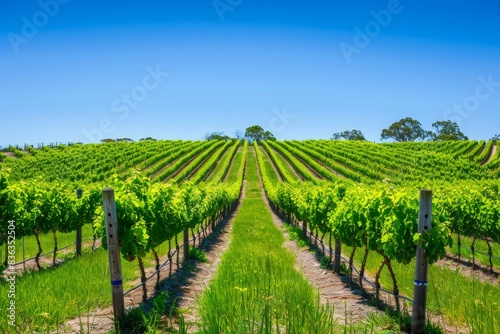 Serene Vineyard Landscape with Lush Grapevines and Blue Sky Copyspace