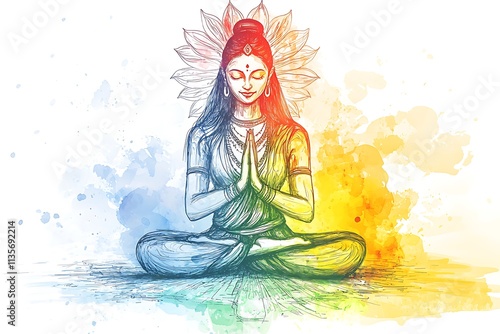 yoga, meditation, woman, female, peaceful, serene, spiritual, goddess, india, hindu, culture, religion, lotus, pose, watercolor, illustration, art, drawing, vignetting, colourful, vibrant, calmness, mindfulness, calm, peace, harmony