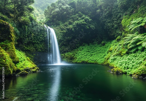 Serene Waterfall Cascading Down Lush Green Cliffs Surrounded by Vibrant Foliage and Tranquil Pool Reflecting Nature's Beauty