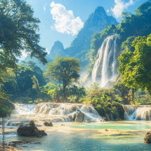 waterfall, forest, mountain, nature, river, landscape, greenery, sunlight, rock, mist, calmness, scenery, travel, adventure, environment, flora, fauna, ecosystem, beauty, serenity, water, sky, cloud, biodiversity, wilderness, stream, pool, vibrant, peaceful, exploration, hiking, relaxation, natural, scenic, idylli, refreshing, lush, picturesque, terrain, harmony, geology, summer, destination, escape, wildlife, inspiration, rejuvenation