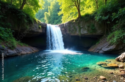 waterfall, turquoise, pool, forest, serene, nature, cascade, water, beauty, landscape, greenery, calmness, peaceful, outdoors, rock, sunlight, summer, scenic, travel, environment, river, peacefulness, forested, refreshing, adventure, pure, natural, idylli, escape, remote, hidden, unspoiled, lush, flow, destination, harmony, pristine, wilderness, aquatic, relaxation, brilliancy, scene, exploration, ecosystem, terrain, habitat