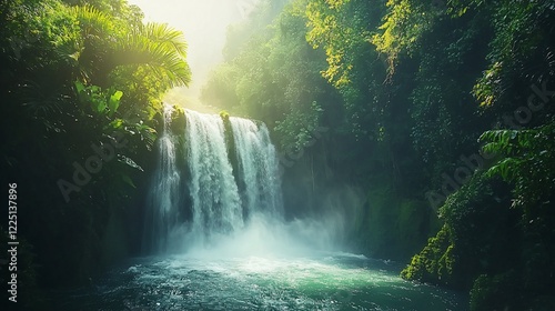 Serene waterfall cascading into a tranquil pool, surrounded by lush greenery in a misty jungle