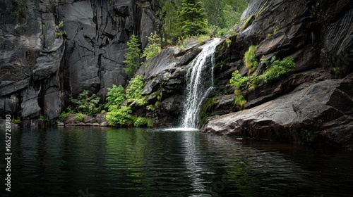 Serene Waterfall Cascading into Calm Reflective Pool Surrounded by Lush Greenery and Rocky Cliffs in Nature Landscape