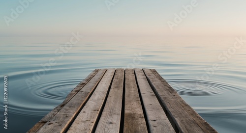 Serene Waterfront Scene with Wooden Deck and Calm Waters in Background.