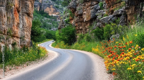 road, mountain, winding, gorge, canyon, scenic, nature, landscape, travel, adventure, summer, flower, rock, hill, path, curve, asphalt, drive, journey, trip, way, route, highway, countryside, spring, blossom, bloom, flora, vegetation, wildflower, colours, vibrant, beauty, scenery, photo, image, picture, view, daylight
