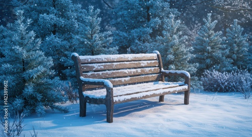 Serene Winter Bench: A Snowy Escape in a Frosty Forest