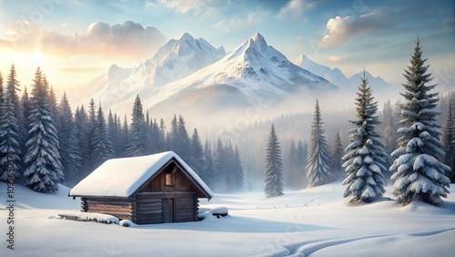 Serene Winter Cabin nestled in a snow-covered mountain forest at sunrise