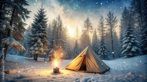snow, winter, forest, tree, tent, campfire, fire, night, star, cold, snow-covered, landscape, nature, outdoors, scenic, serene, peaceful, magical, wilderness, adventure, camping