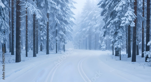 Serene Winter Landscape of a Snow-Covered Road Winding Through a Dense Forest of Frost-Dusted Pine Trees, Evoking a Sense of Tranquility and Natural Beauty