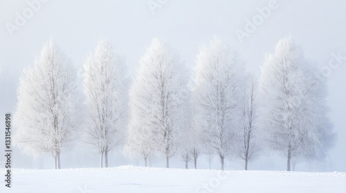 Serene Winter Landscape with Frosted Trees in Soft Fog and Snowy Ground