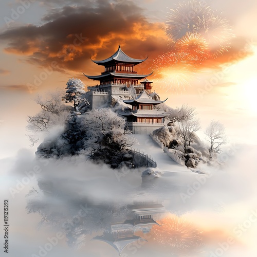 serene, winter, landscape, majestic, chinese, building, pale, gold, cloud, fireworks, display, against, vibrant, sky, highly, detailed, three-dimensional, render