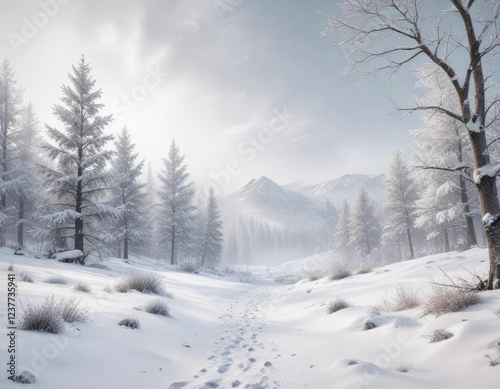 serene winter landscape with snowflakes gently falling on a white background , icy, stillness